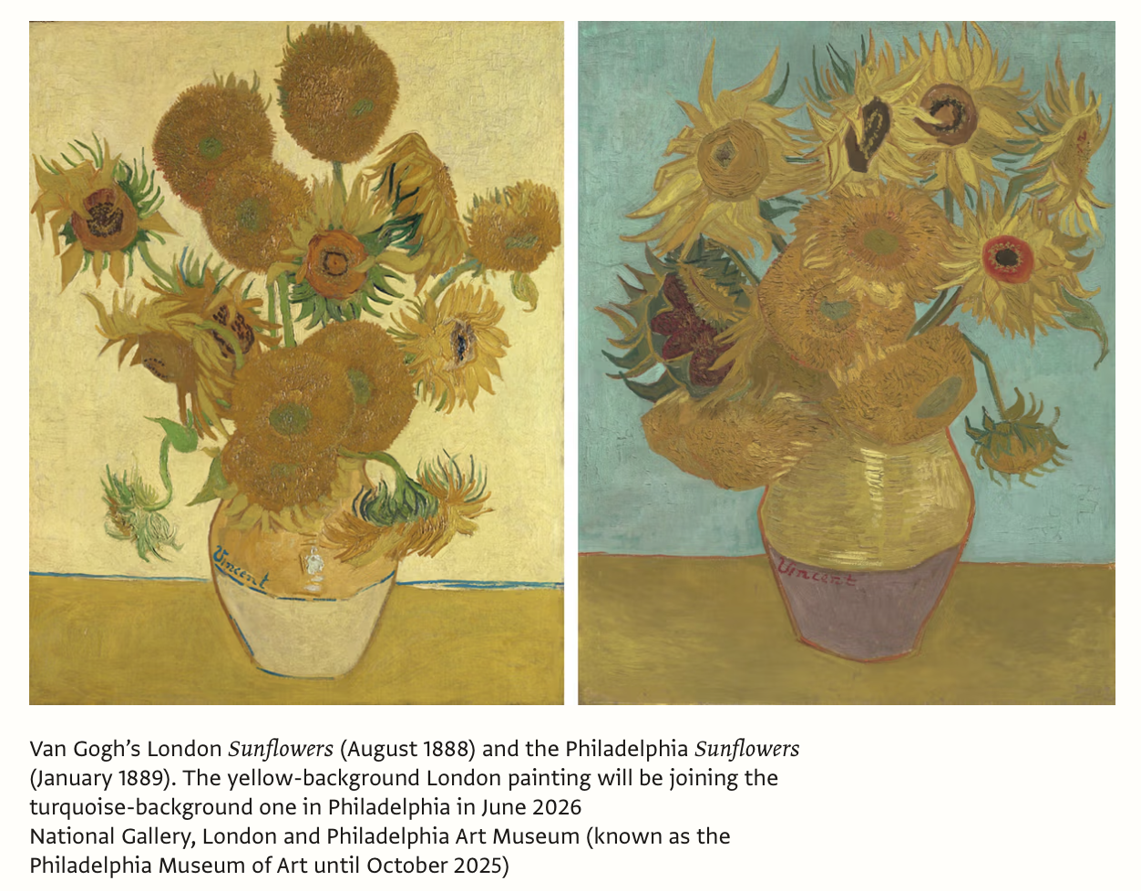 Next year the Philadelphia Museum of Art will pull off something special. It is bringing together two of Van Gogh’s famous Sunflowers paintings for a show running from June to October 2026. Philadelphia will display its own turquoise version from 1889 alongside the National Gallery’s iconic yellow-background version from 1888. London almost never lets that painting leave the country, so the loan is a genuine sign of trust after Philadelphia agreed to lend its own picture to London’s big Van Gogh show in 2024.